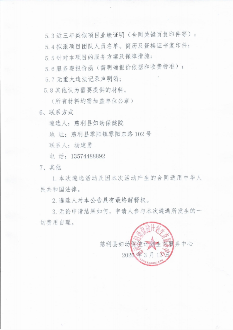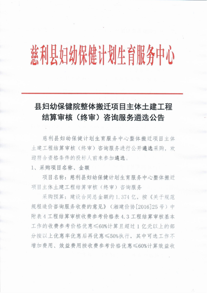 【采购】慈利县妇幼保健院整体搬迁项目主体土建工程结算审核(终审)咨询服务遴选公告